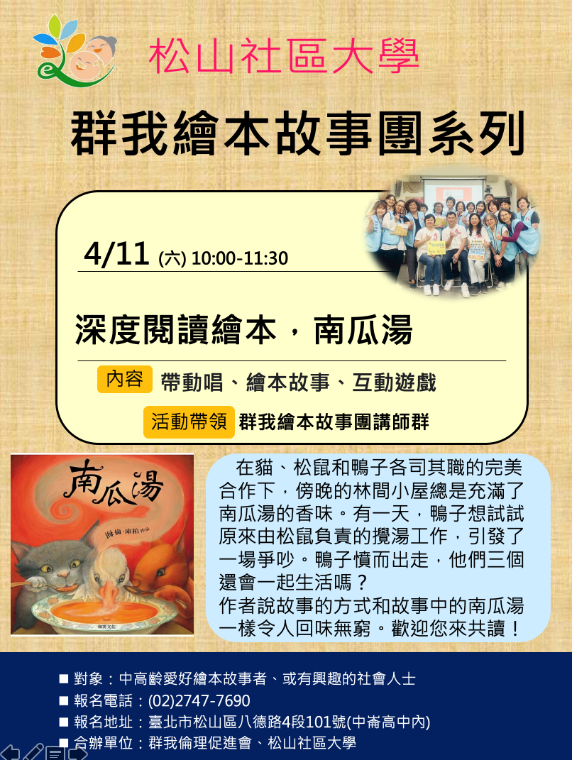 🌟 活動快訊|群我繪本故事團系列:深度閱讀繪本,南瓜湯🥣【繪本時光】吵架了怎麼辦?跟著《南瓜湯》學習和好的藝術!在森林的小屋裡,貓、松鼠和鴨子總是分工合作,煮出世界上最美味的南瓜湯。但有一天,鴨子突然想換個工作……結果一場大爭執爆發了!鴨子氣得離家出走,這份友誼還能走下去嗎?誠摯邀請對繪本有興趣的中高齡朋友與社會大眾,跟著「群我繪本故事團」一起走進這則關於友情、包容與合作的動人故事。✨ 活動亮點:🎵 活力帶動唱:舒展筋骨,開啟好心情。📖 深度導讀:細細品味繪本大師海倫.庫柏的經典名作。🎮 互動遊戲:在歡笑中體驗故事背後的「群我」智慧。📅 活動時間:4/11 (六) 10:00 - 11:30📍🌟 活動快訊|群我繪本故事團系列:深度閱讀繪本,南瓜湯活動日期:2026-04-11