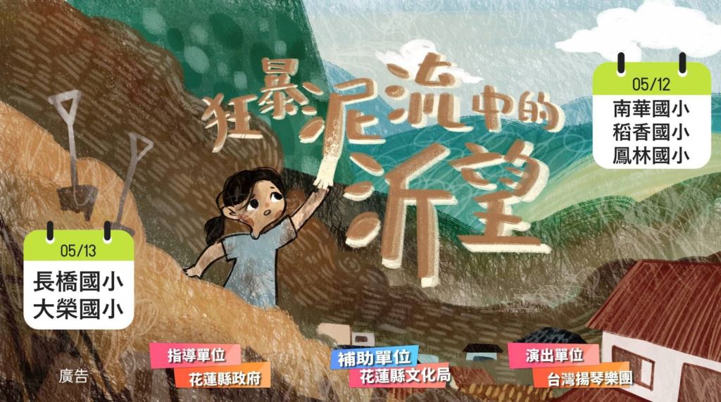 我們以花蓮縣光復鄉馬太鞍溪泥流災難中看到的人性光輝與全臺民眾自動支援的畫面為靈感,結合客家歌謠曲調、動畫繪本、揚琴演奏及主持人說故事方式,製作「狂暴泥流中的『沂』望-勵志繪本故事推廣音樂會」。透過音樂及動畫告訴孩子們要勇敢、要有愛心,學習阿公、阿婆犧牲自我的偉大情操。