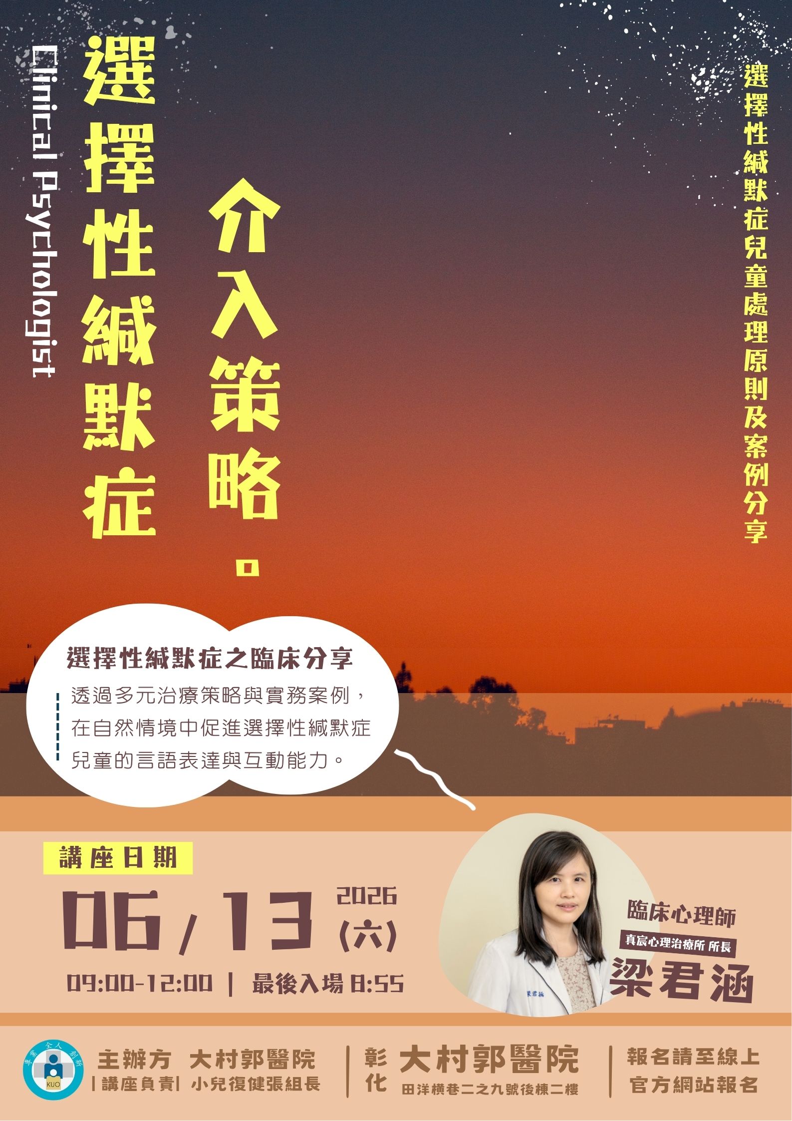 本講座為免費課程,主題為「選擇性緘默症兒童處理原則及案例分享」,旨在提供特殊教育人員與臨床治療師相關專業新知。課程內容涵蓋選擇性緘默症的典型表現、臨床教學原則及實際案例分享。