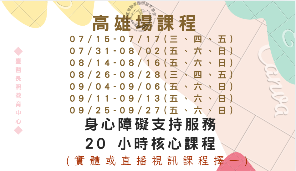 高雄場(實體+直播視訊): 身心障礙支持服務20 小時核心課程 7/15-17、7/31-8/2、8/14-16、8/26-28、9/4-6、9/11-13、9/25-27
