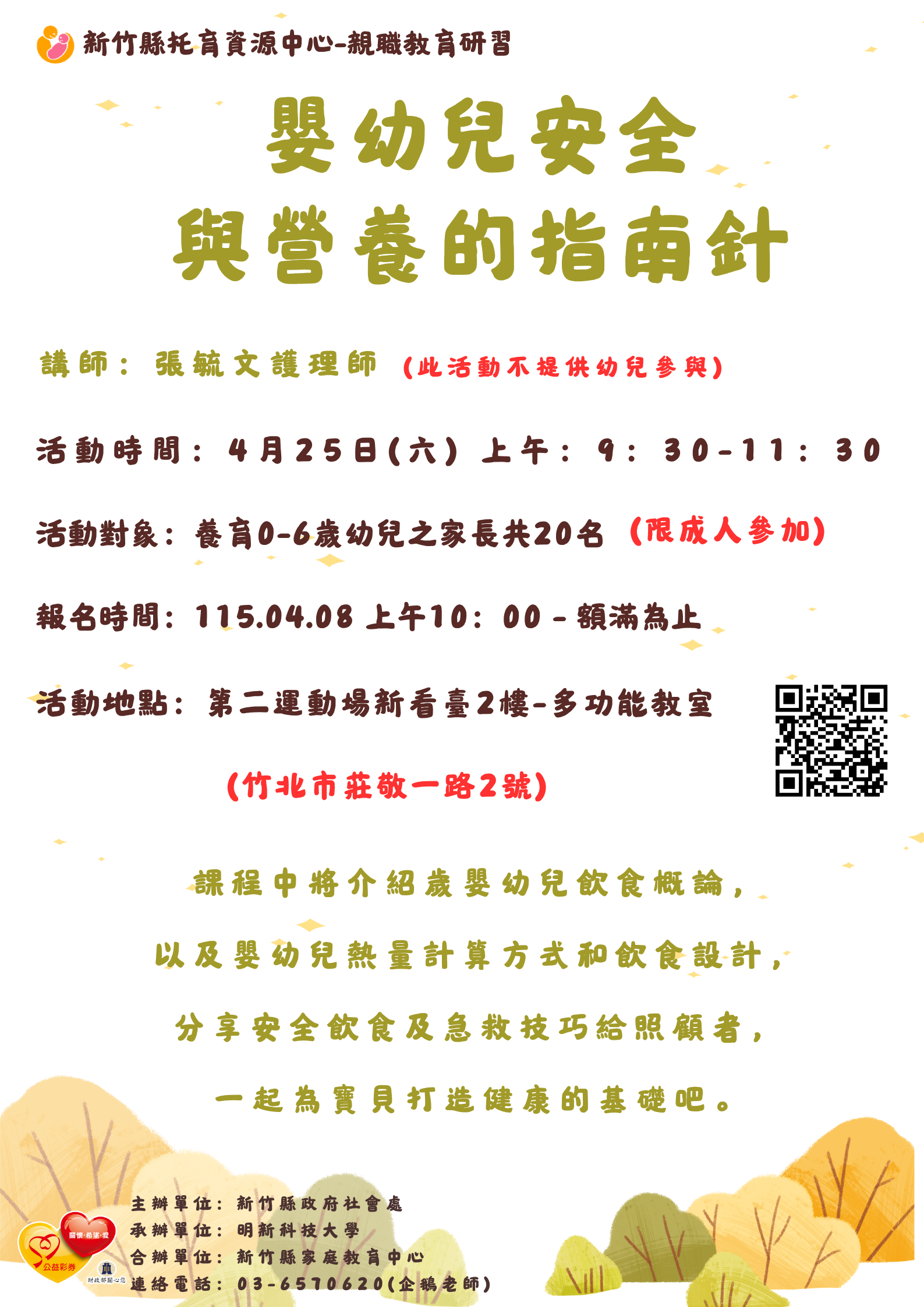 新竹縣托育資源中心-親職教育研習-嬰幼兒安全與營養的指南針活動日期:2026-04-25 - BeClass 線上報名系統 Online Registration Form