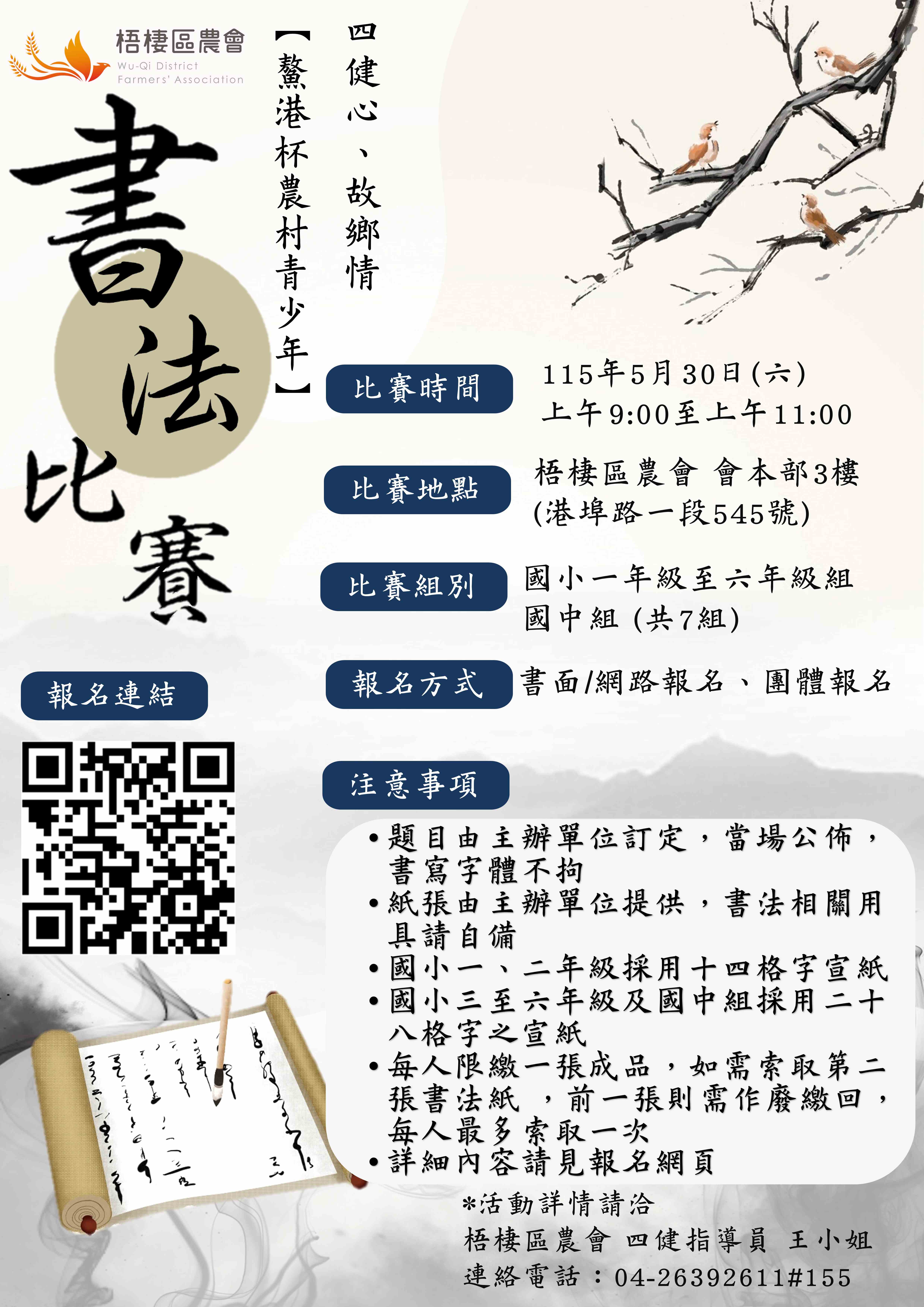梧棲區農會 115年度四健心、故鄉情~鰲港杯農村青少年書法比賽活動日期:2026-05-30 ,文化/藝文, 競賽, - BeClass 線上報名系統 Online Registration Form