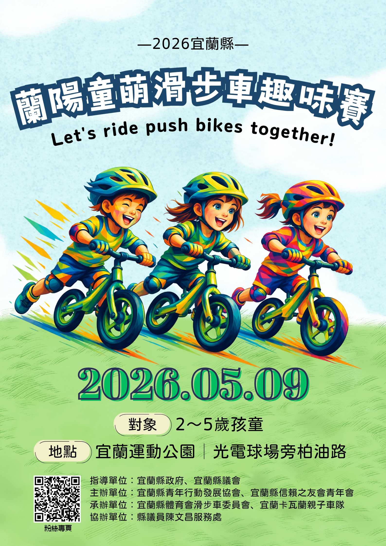 2026蘭陽童萌滑步車趣味賽▲賽事時間:2026/05/9(六) 09:00 AM~11:30 AM (實際賽事時間於賽前一週公告)▲賽事地點:宜蘭運動公園 光電球場旁▲賽事地址:宜蘭縣宜蘭市中山路一段755號▲參加限制:限符合分組年紀之小車手,及12寸以下輪組之各廠牌滑步車(無剎車及其他動力裝置) 。▲報名日期:即日起至4/15或額滿為止。▲報名費用:每人/200元。一、指導單位:宜蘭縣政府、宜蘭縣議會二、主辦單位:宜蘭縣青年行動發展協會、宜蘭縣信賴台灣之友會三、承辦單位:宜蘭縣體育會滑步車委員會、宜蘭卡瓦蘭親子車隊四、協辦單位:立法委員陳俊宇服務處、縣議員陳文昌服務處▲獎勵制度:為鼓勵2026蘭陽童萌滑步車趣味賽活動日期:2026-05-09