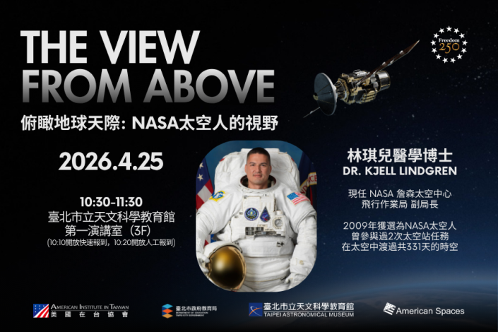 4月25日(六)10:30~11:30,美國在臺協會AIT邀請NASA太空人Dr. Kjell N. Lindgren,以「俯瞰地球天際-NASA太空人的視野」為題,英文口說分享約20分鐘影片,帶領大眾從太空人的視角俯瞰地球天際,並接受現場觀眾問答(現場有中文翻譯),歡迎闔家蒞臨參加講座。