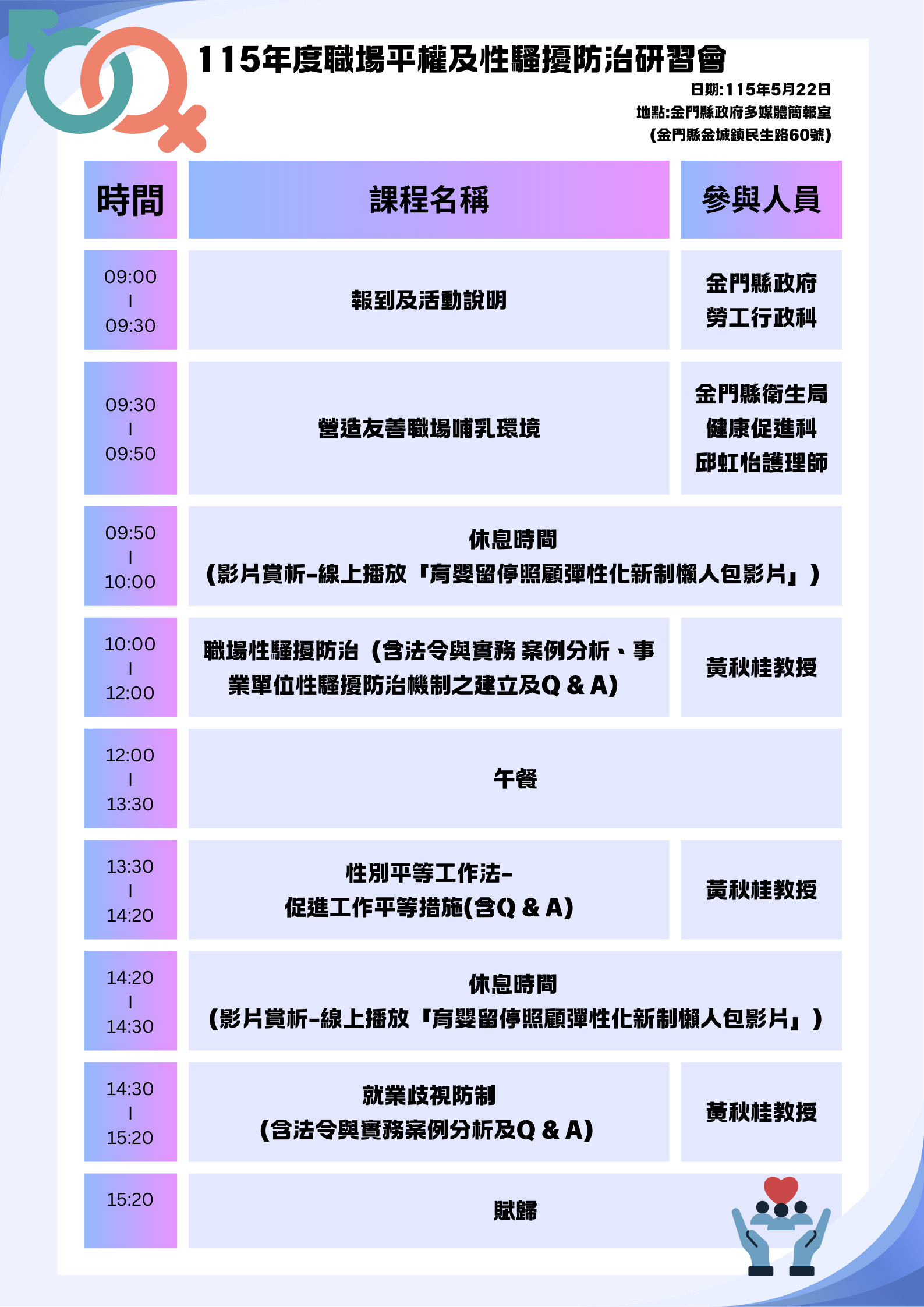 115年度職場平權及性騷擾防治研習會,報到時間:115年05月22日(星期五)09:00-09:30,地點:金門縣政府多媒體簡報室(金門縣金城鎮民生路60號)。
