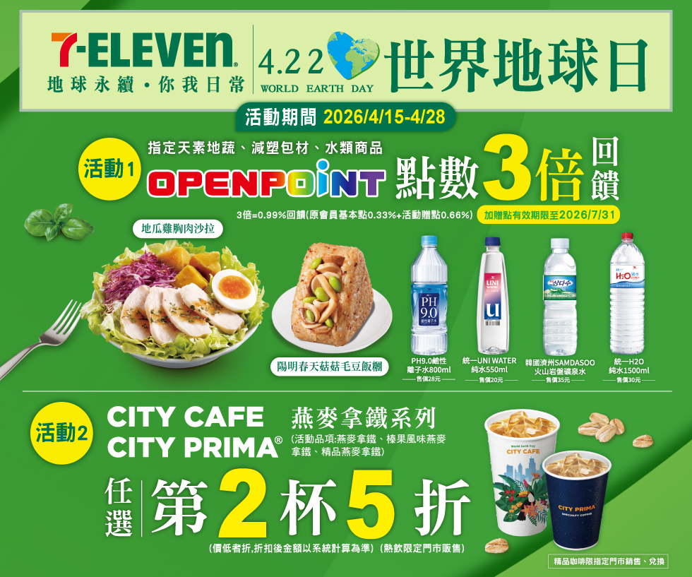 4月22日世界地球日,7-ELEVEN推出雙主題活動,鼓勵消費者透過日常購物行動參與環保行動。活動包含指定商品累積OPENPOINT點數回饋與咖啡飲品折扣方案。