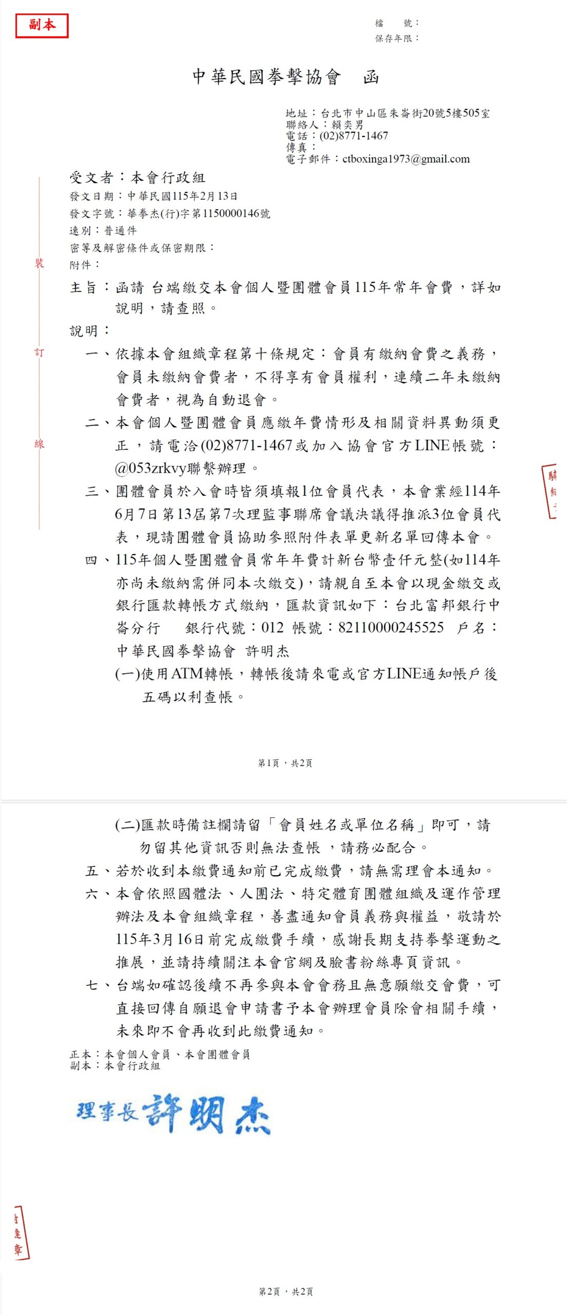 【公告】115年個人暨團體會員常年會費繳費通知 – 中華民國拳擊協會 Skip to content