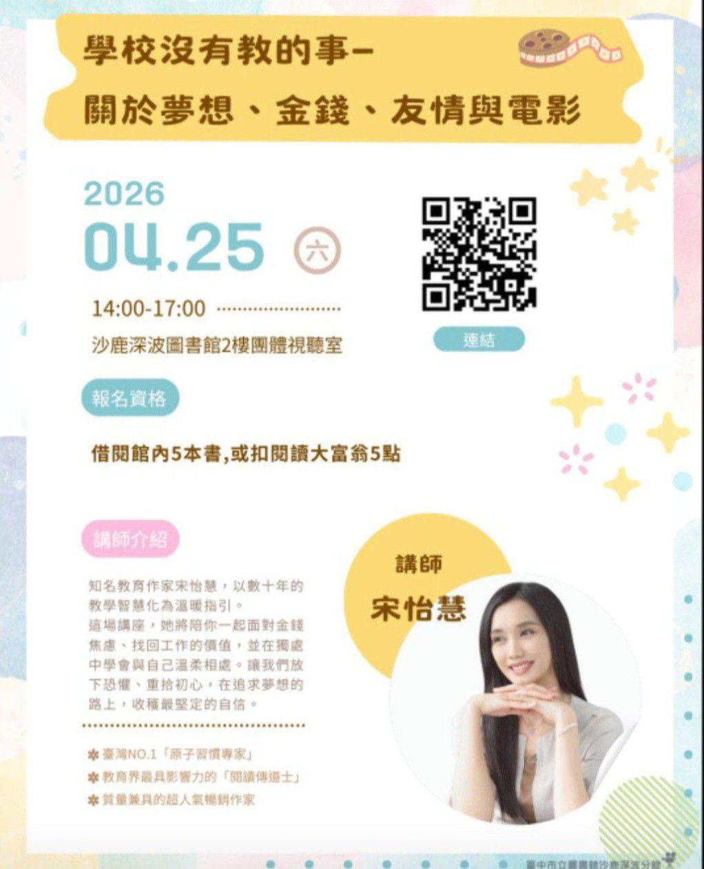 - 時間:115年4月25日(星期六)14:00-17:00地點:沙鹿深波分館2樓團體視聽室題目:學校沒有教的事~關於夢想、金錢、友情與電影講師:宋怡慧老師內容:本次講座邀請知名教育界講者宋怡慧老師,以其數十年的教學經驗分享人生智慧。內容涵蓋夢想與勇氣、金錢與價值、孤獨與連結,以及電影與人生,幫助參與者在挫折中找回初心,擺脫金錢焦慮,建立真誠友誼,並透過光影藝術理解生命的深度。無論職場人士、學生或家長,都是尋找心靈安頓、踏出人生新步伐的良機,歡迎參加。