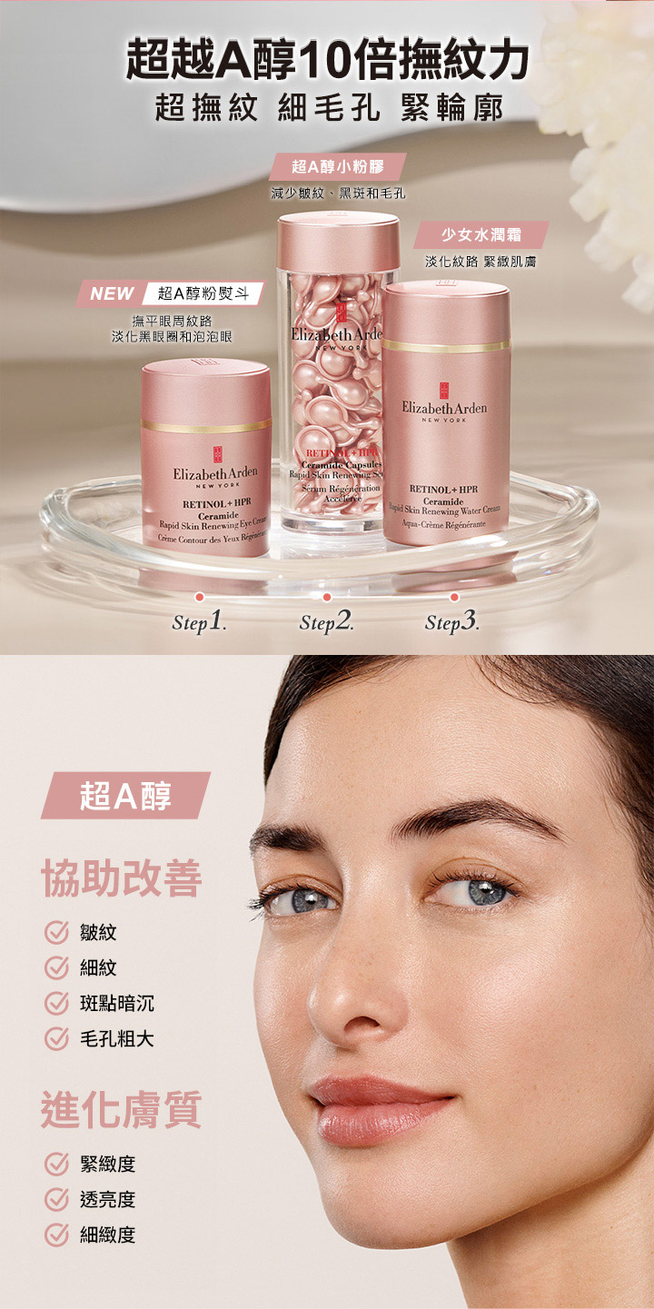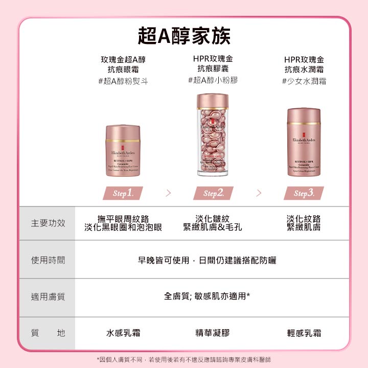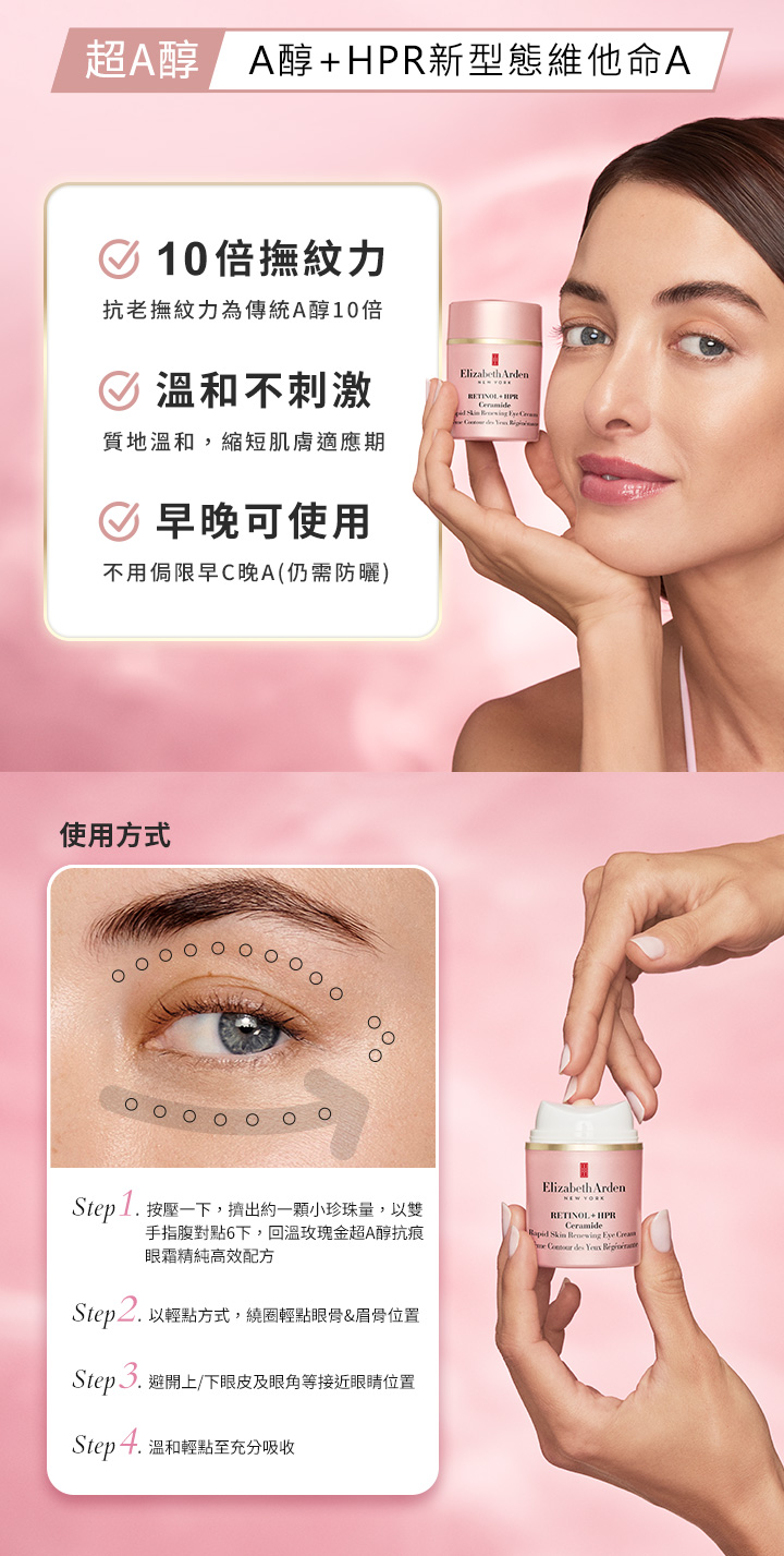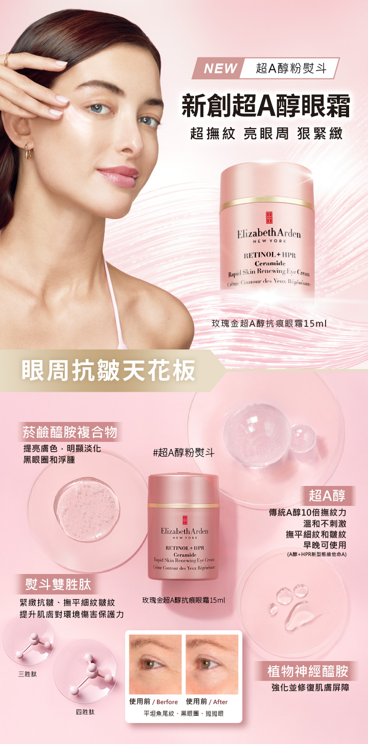 想使用傳統A醇卻擔心經歷肌膚敏感刺激適應期、與僅限夜晚使用的困擾?來自紐約的百年保養專家伊麗莎白雅頓全新推出玫瑰金超A醇抗痕眼霜 #超A醇粉熨斗,A醇升級超A醇,抗老效果為傳統A醇10倍,且溫和不刺激,早晚可使用,突破傳統A醇撫紋限制,直上抗老天花板。含有超A醇、熨斗雙胜肽、植萃神經醯胺等多重抗皺抗老修護配方,新手也能輕鬆嘗試,改善眼周皺紋、細紋、黑眼圈、泡泡眼,超A醇粉熨斗滑過,隱形歲月痕跡,讓妳一個眼神給出去,電力無限、青春減齡。