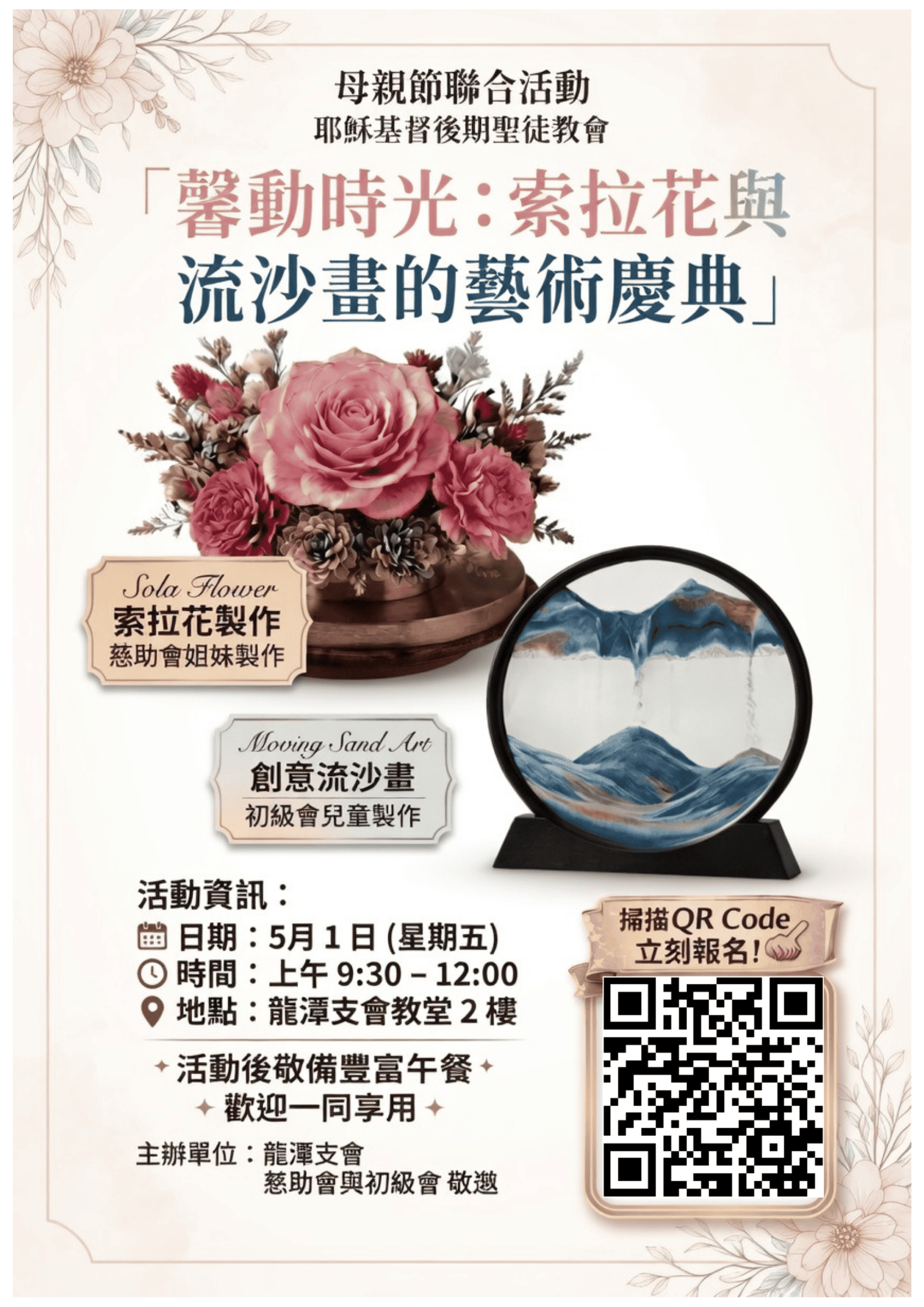 在溫馨的五月,由耶穌基督後期聖徒教會 龍潭支會誠摯邀請您與家人一同來到龍潭支會,透過雙手的溫度,創作出一份送給母親、也送給自己的永恆禮物。