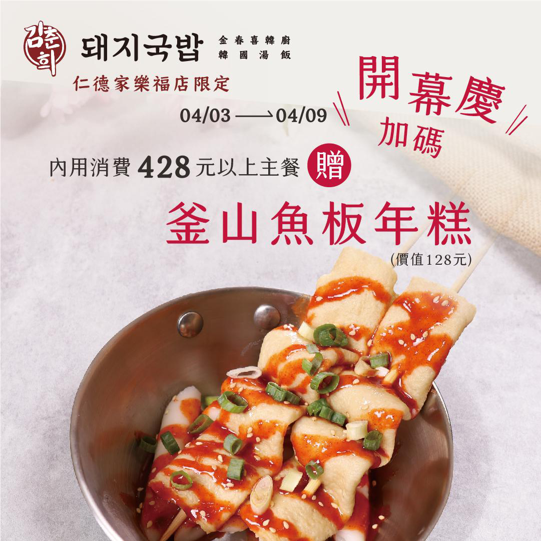 04/03-04/09 內用消費428元以上主餐贈釜山魚板年糕(價值128元)
