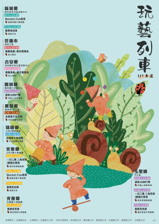 ◎新城鄉-原住民多功能活動中心6/7(日)15:00節目名稱: Bucket Fun鼓秀演出團隊: 重擊現實打擊樂團7/12(日)15:00節目名稱: 歡樂奇幻秀演出團隊:搏逗兄弟◎花蓮市-榮民之家8/7(五)10:00節目名稱:寶鏡荔緣~歌仔戲演出演出團隊:後山劇坊◎吉安鄉-吉安鄉永安社區活動中心8/14(五)10:00節目名稱: 寶鏡荔緣~歌仔戲演出演出團隊:後山劇坊◎鳳林鎮-鳳林國小活動中心4/19(日)15:00節目名稱:頑鼓JUMP!擊演出團隊:艸創心演擊樂場◎萬榮鄉-萬榮鄉-天主堂5/9(六)15:00節目名稱: 小綠仙子出任務演出團隊: 天馬戲創作劇團◎光復鄉-公所3樓大會議室5/23(六)15:00節目名稱: 一日三醒三省吾身/踢踏打擊秀演出團隊: 雷克斯踢踏舞團6/6(六)15:00節目名稱: Bucket Fun鼓秀演出團隊:重擊現實打擊樂團7/11(六)15:00節目名稱:歡樂奇幻秀演出團隊:搏逗兄弟◎光復鄉-光復國小演藝廳7/5(日)15:00節目名稱: 馬戲笑笑屋演出團隊: 優尼客當代馬戲團◎瑞穗鄉-公所4樓演藝廳5/8(五)10:30節目名稱:小綠仙子出任務演出團隊:天馬戲創作劇團◎玉里鎮-中正堂4/18(六)15:00節目名稱: 頑鼓JUMP!擊演出團隊: 艸創心演擊樂場5/24(日)15:00節目名稱: 一日三醒三省吾身/踢踏打擊秀演出團隊: 雷克斯踢踏舞團7/4(六)15:00節目名稱: 馬戲笑笑屋演出團隊: 優尼客當代馬戲團指導單位:花蓮縣政府主辦單位:花蓮縣文化局共同主辦單位:新城鄉公所、鳳林鎮公所、萬榮鄉公所、光復鄉公所、瑞穗鄉公所、 玉里鎮公所