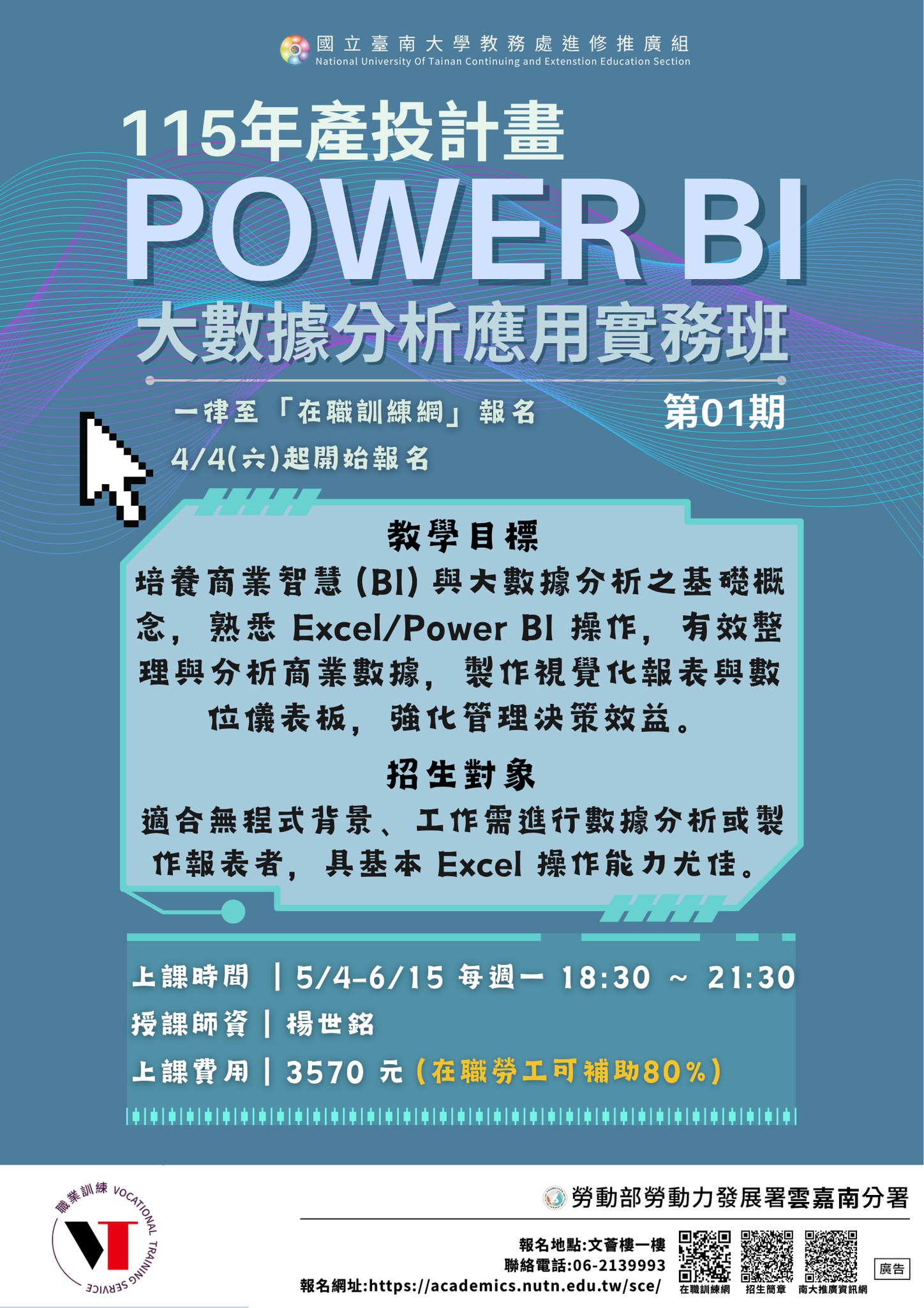 國立臺南大學【115年產業人才投資計畫】POWER BI大數據分析應用實務班第01期(一律至「在職訓練網」報名,5/1(五)結束報名)