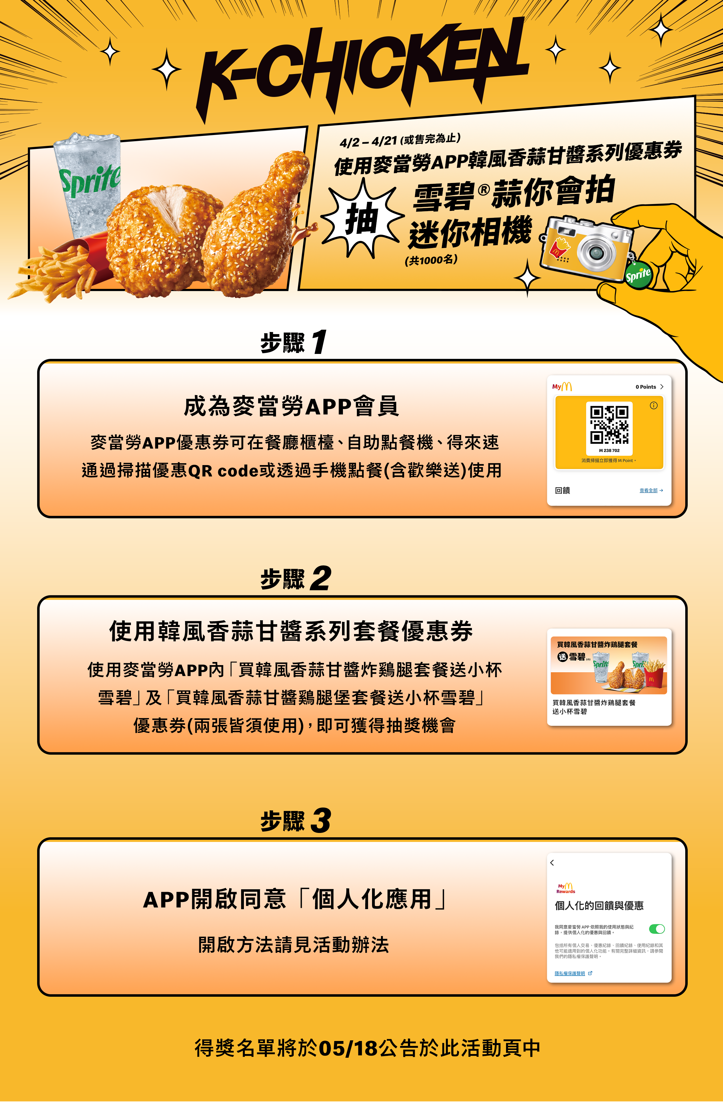 - 活動期間2026年4月2日10:30至2026年4月21日23:59或售完為止,使用麥當勞APP「買韓風香蒜甘醬炸鷄腿套餐送小杯雪碧」優惠券及「買韓風香蒜甘醬鷄腿堡套餐送小杯雪碧」優惠券,且均無退款記錄,並於2026年5月27日23:59前維持勾選「我同意從電子郵件或簡訊或其他方式接收到台灣的麥當勞餐廳優惠活動及最新訊息的通知」以及「麥當勞APP全球版會員與會員註冊之Email有效帳戶」者,始具備抽獎資格。將隨機抽出1,000位贈送「雪碧®蒜你會拍迷你相機乙份」。