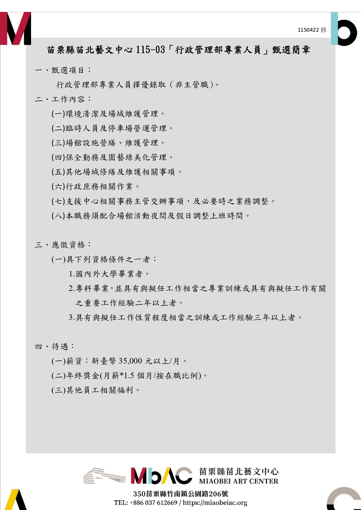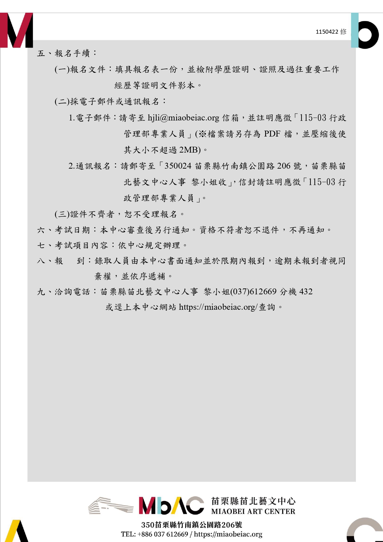 115-03 行政管理部專業人員 甄選 - 苗栗縣苗北藝文中心 跳至主要內容區塊